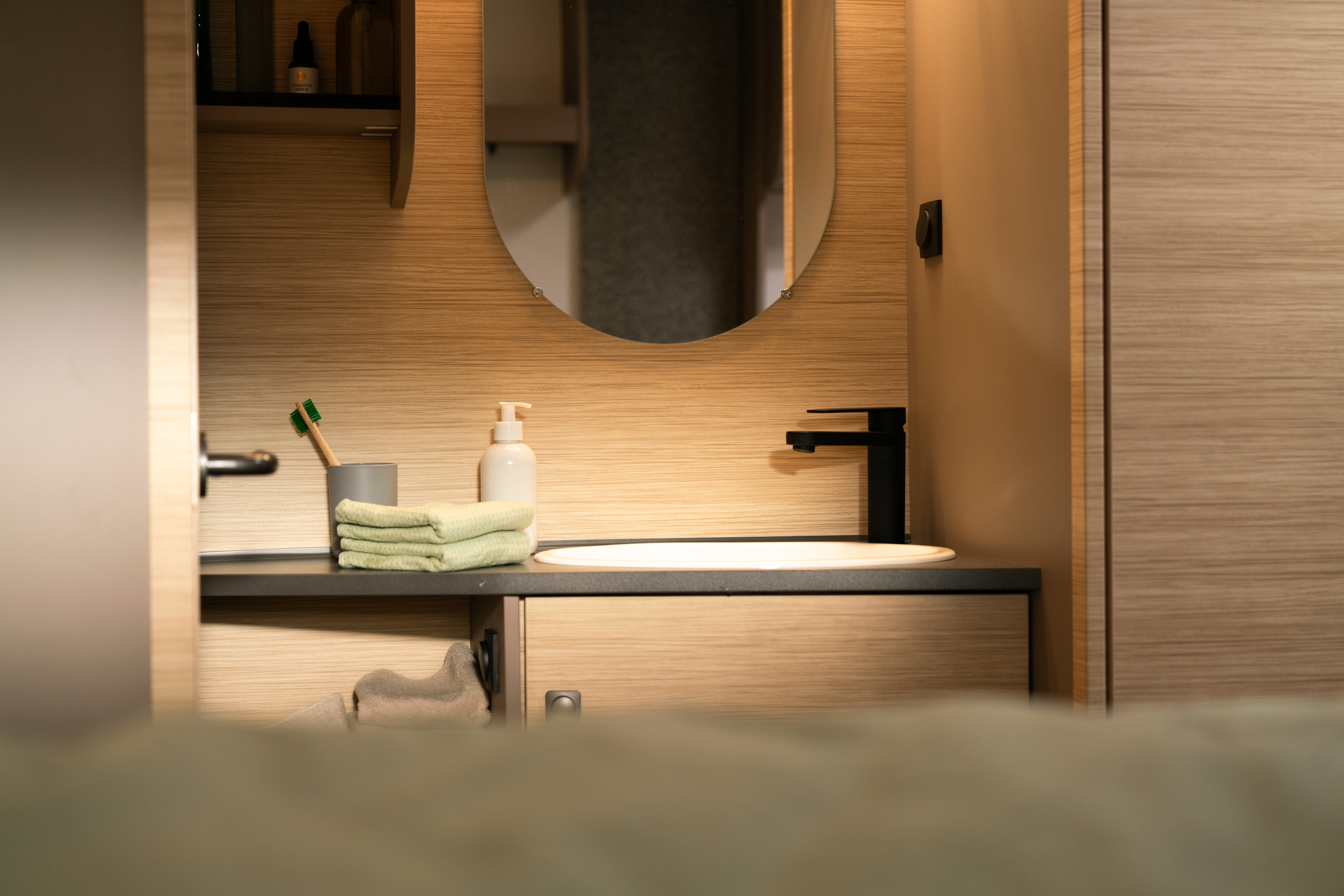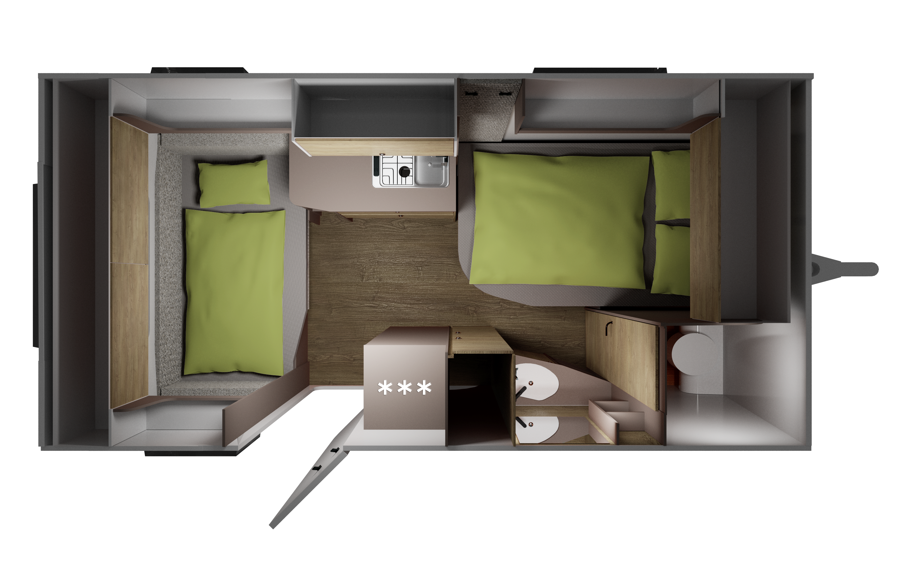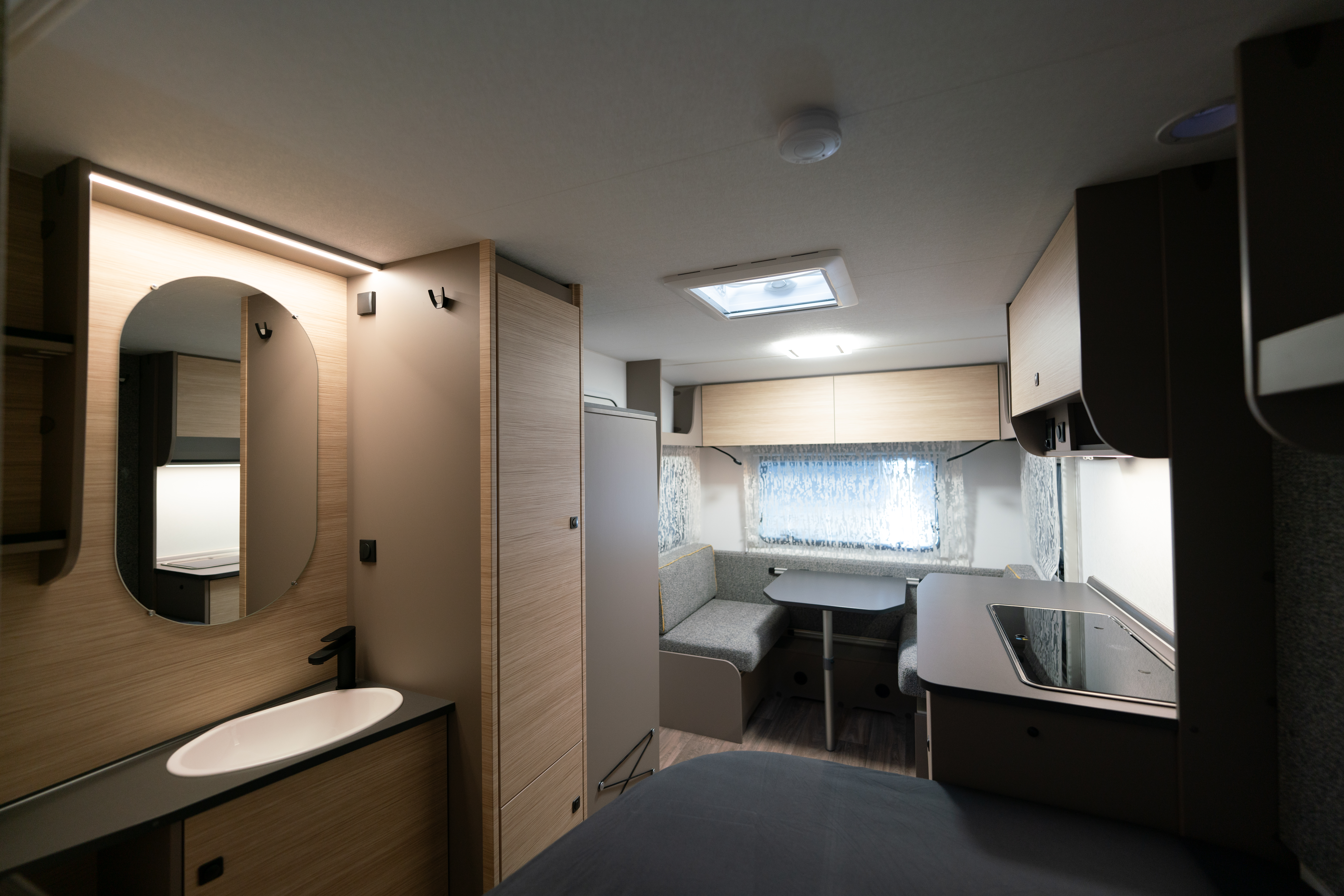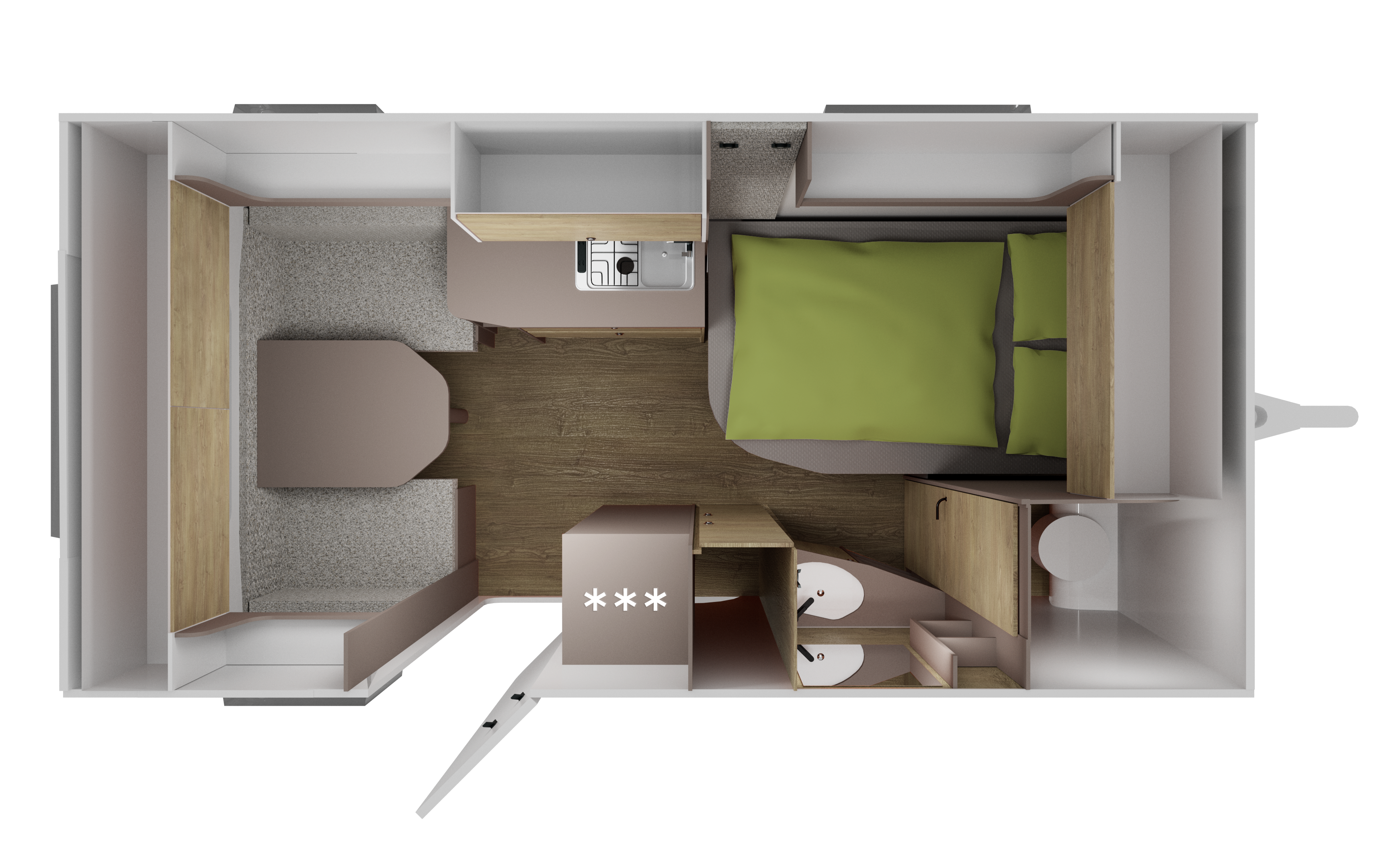 Pieni matkailuvaunu, jossa on pesutila ja WC sekä mukavat tilat oleskeluun ja nukkumiseen. Kaikki mitä tarvitset – selkeällä muotoilulla ja huippulaadulla samassa paketissa.