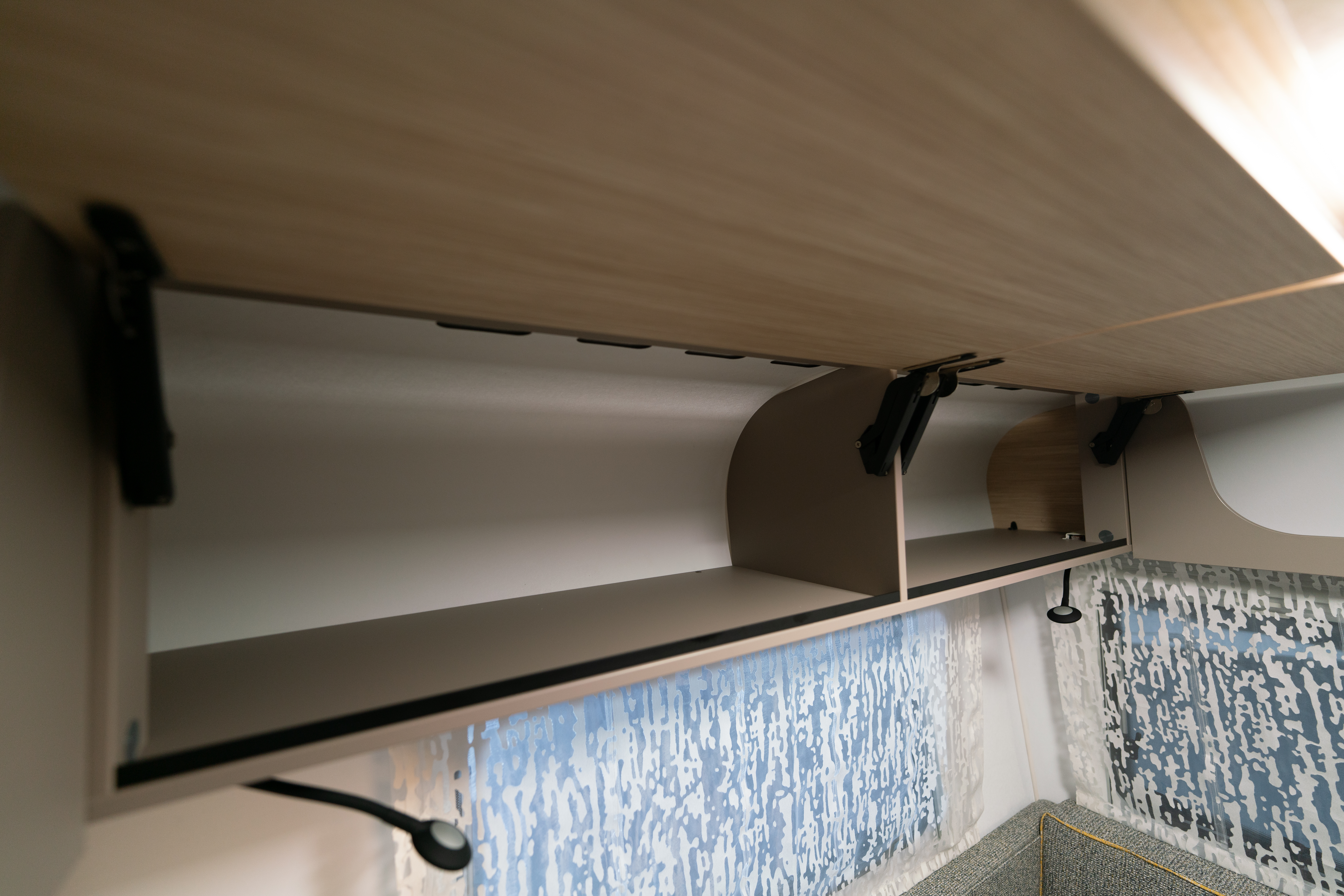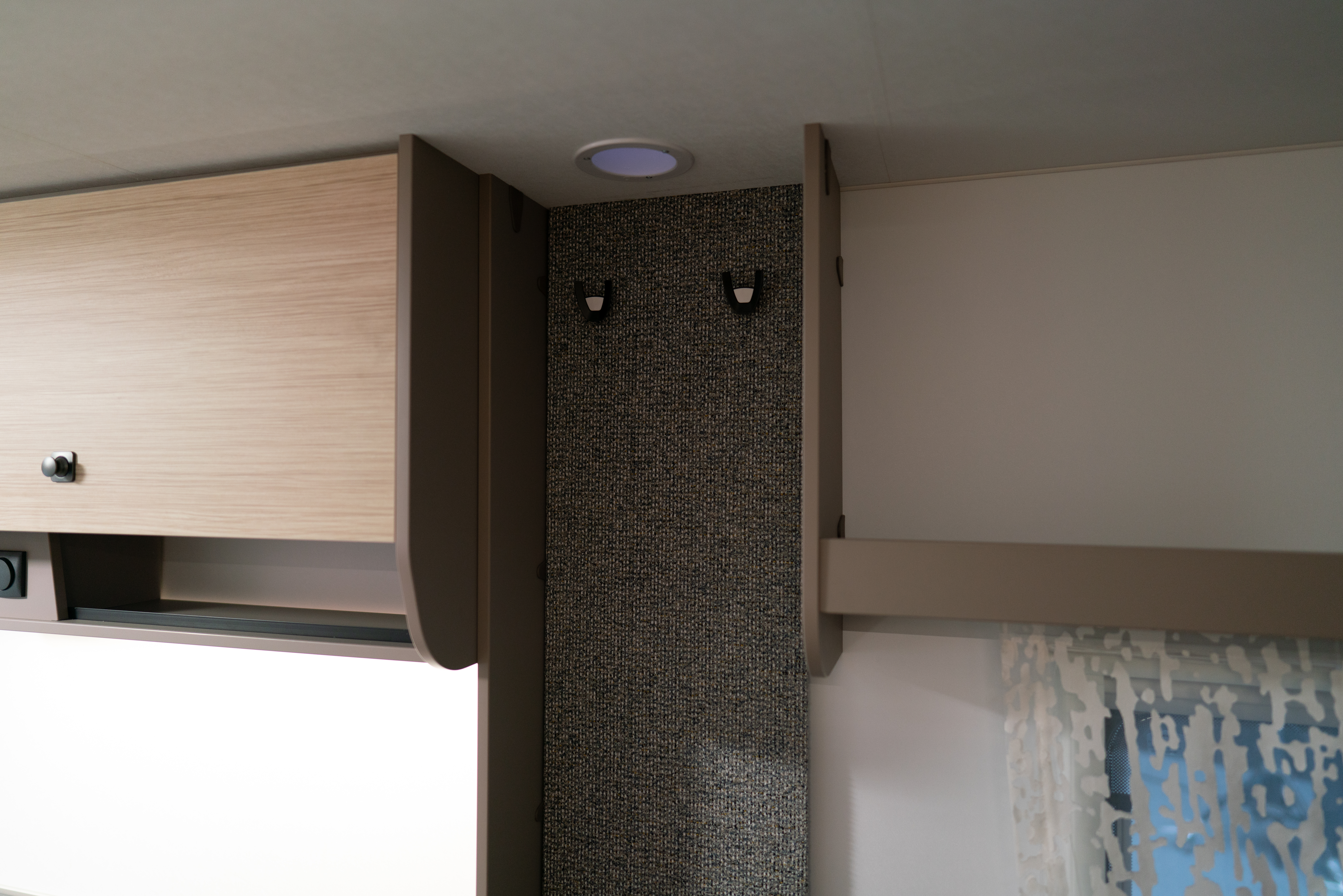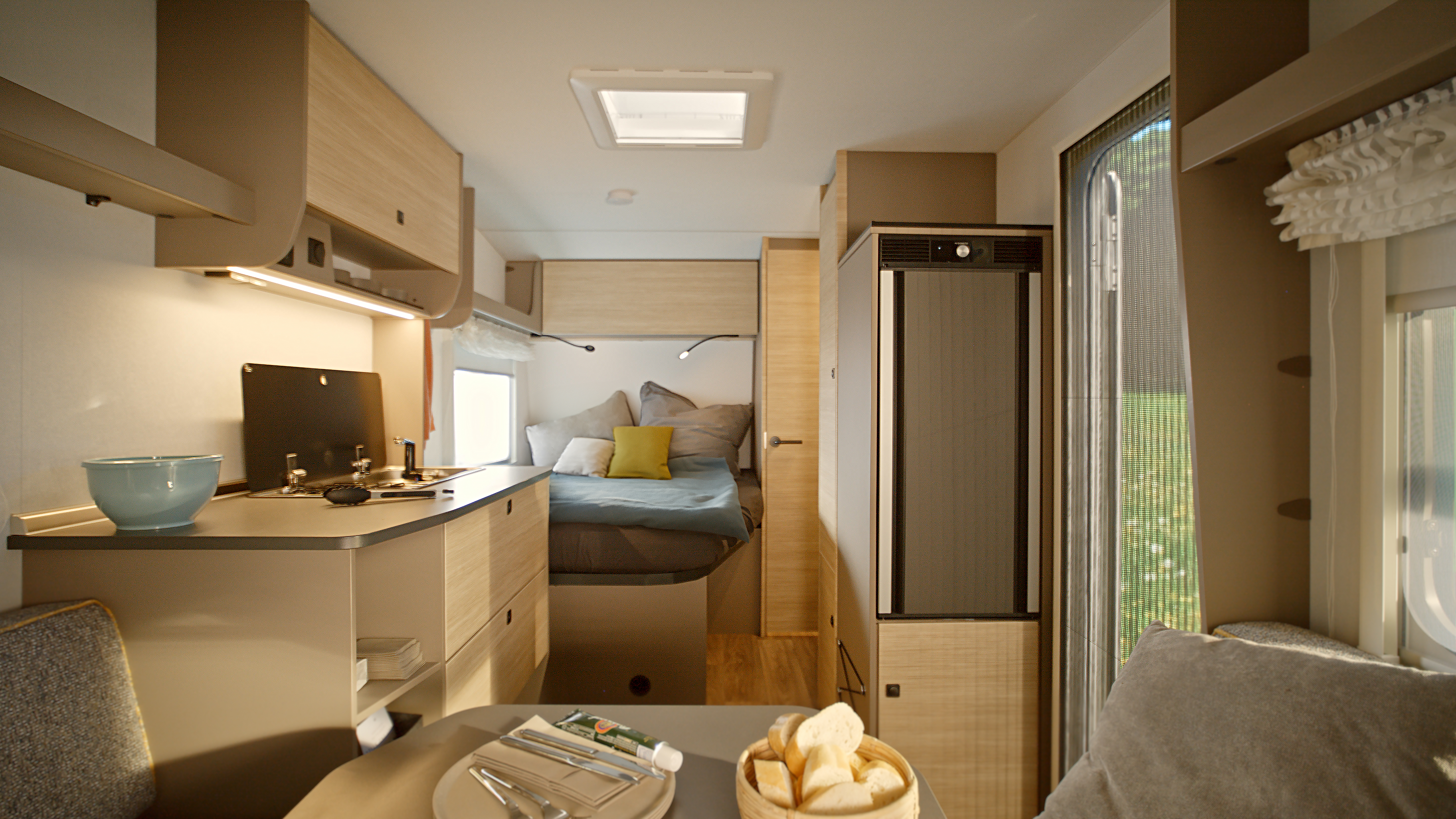 Rentoudu ja nauti viihtyisässä istuinryhmässä, josta avautuvat hienot näkymät kolmen ikkunan ja kattoikkunan kautta. Tunnelmallinen LED-valaistus luo oikean fiiliksen, rullaverhot tarjoavat suojaa, ja sohva muuntuu helposti lisävuoteeksi kolmannelle nukkujalle.