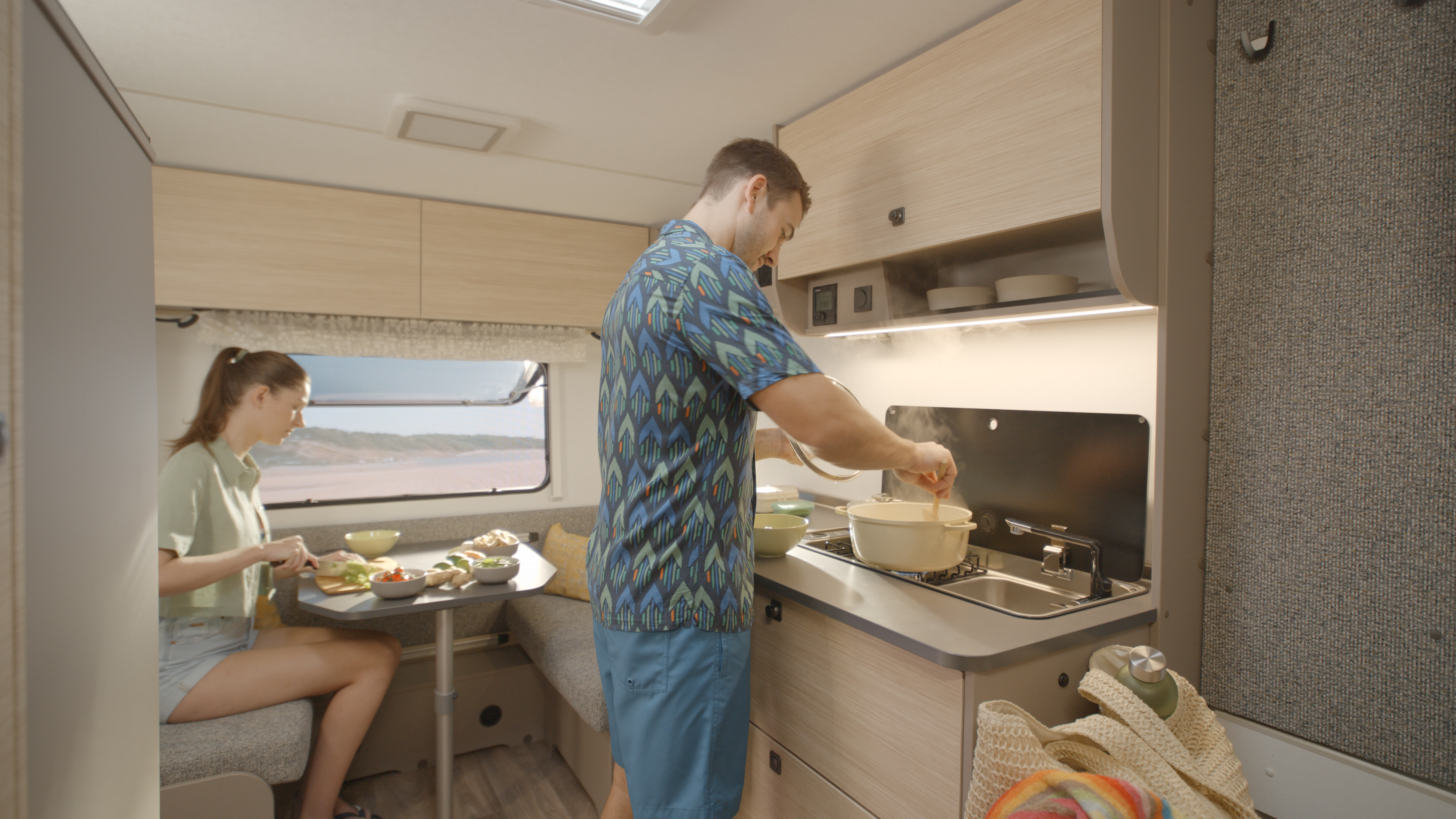 NEXT-matkailuvaunulla oma ravintola kulkee aina mukana! Pienessä, mutta toimivassa keittiössä, jossa on 2-liekkinen kaasuliesi, kaksiovinen jääkaappi ja reilusti säilytystilaa, voit loihtia lempiruoat missä tahansa – oli ympärillä sitten metsä tai meri.